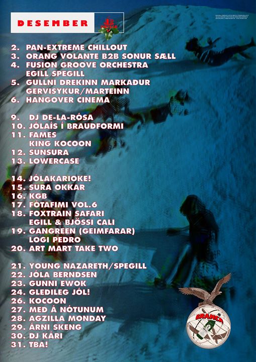 Plötusnúðastúkan er þéttsetin af usual suspects og meðal stærri eventa er hægt að nefna Jólaísinn í brauðformi, Kariokí, Fótafimi snýr aftur, Berndsen með sitt árlega jólaball, Foxtrain Safari með jólatónleika, fata og listamarkaðir í portinu, mikið stuð mikið gaman.